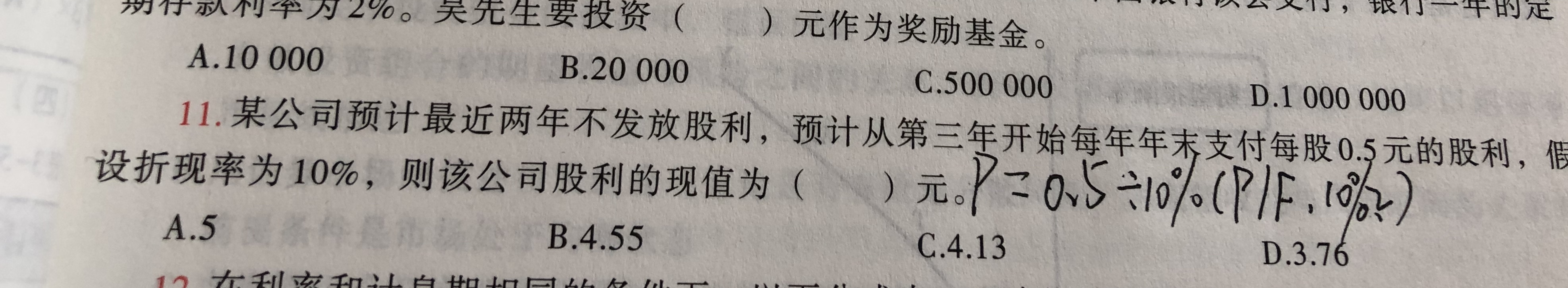 因为从第三年开始每年年末支付0.5元的股利,意思是从第三年年末开始股利可以当作是一种用永续年金,所以先将永续年金折现到第二年年末,然后将第二年年末的股利现值复利折现到当前时点。