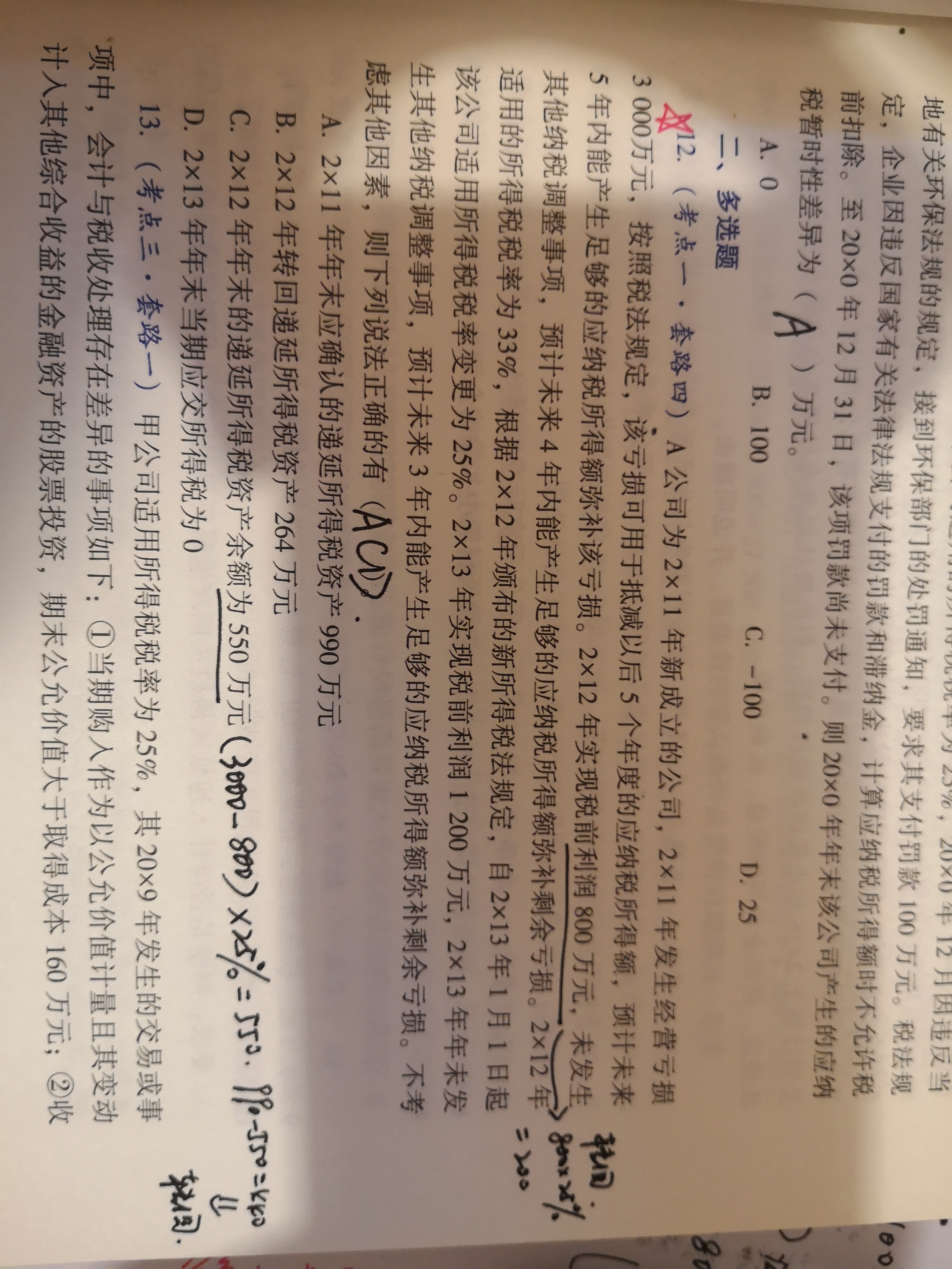 c选项你的计算思路是正确的。亏损并不产生资产负债,所以没有账面价值和计税基础一说,只是根据估计未来能否补亏即转回来确定差异和递延所得税。