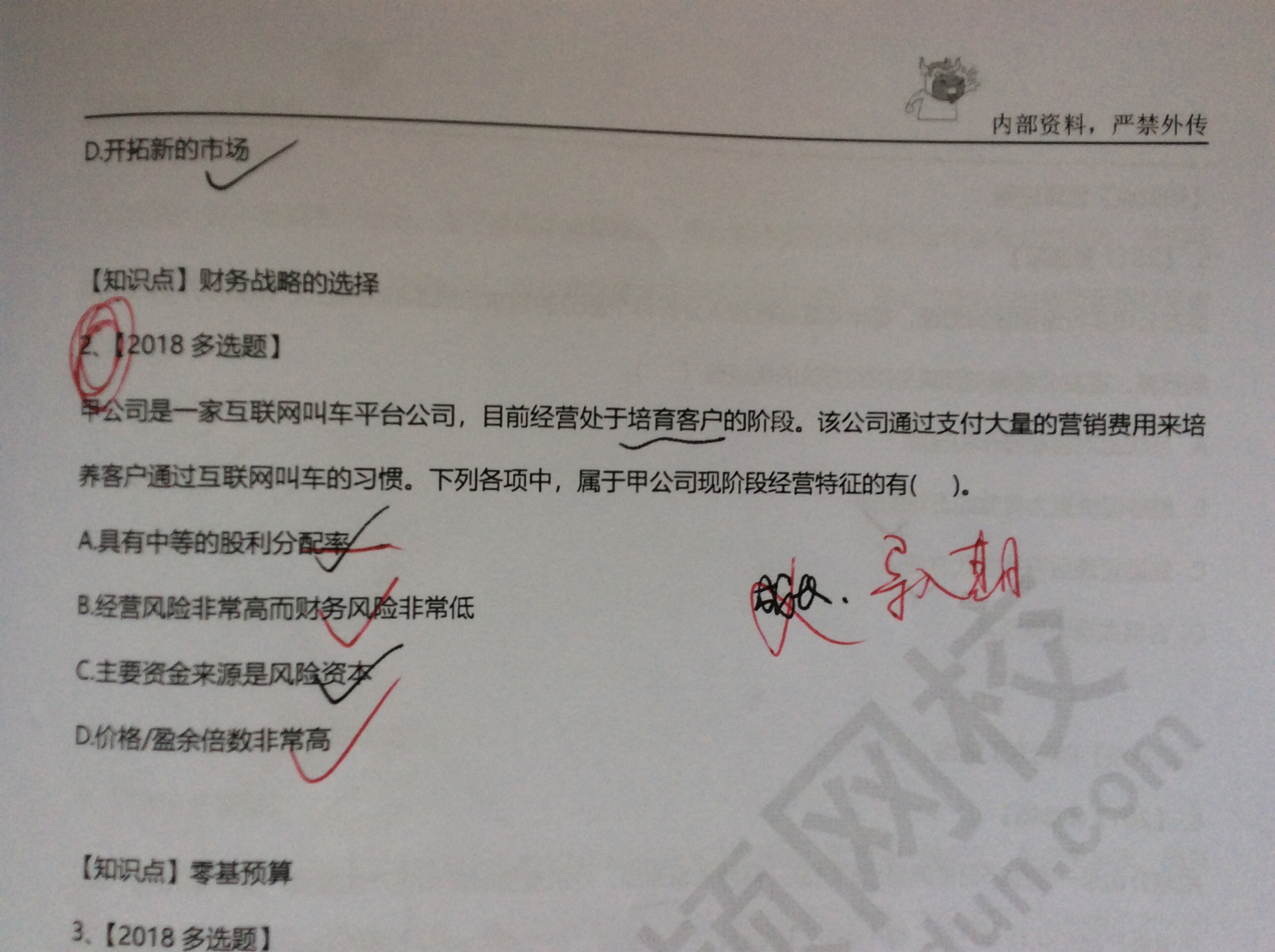 在这道真题中,提到了培养客户习惯,也就是说该产业刚刚兴起,用户还没有使用互联网约车的习惯。该企业经营风险非常高,因为产品是否能够获得成功,是否能被顾客接受都存在很大不确定性。而成长期的经营风险在于竞争激烈,产品市场份额是否能够保持具有不确定性。
