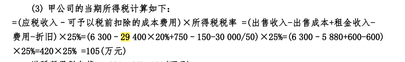 老师,1、调整当期利润时,标黄的那个29400,为啥卖的20%的成本要用29400?这个是提完一年折旧后的数,可是后面也减折旧了呀,不是重复减折旧了么? 2、题目并没给出出售的具体时间点,怎么就判断是提了一整年折旧后再卖的呢,就不是年中卖吗? 3、以公允模式核算的投资性房地产若是出售,出售成本为什么不按账面数?假如每年年末才刷一次公允,且是年中出售,那出售成本应该是30000*20%,收益就是6300-6000=300;年末刷过公允后再卖,出售成本应该是3.15*1万平米*20%=6300,就是按公允价卖,收益是0了?所以答案算法没理明白6300-29400*20%...。 我觉得应该是先算会计利润再调整吧