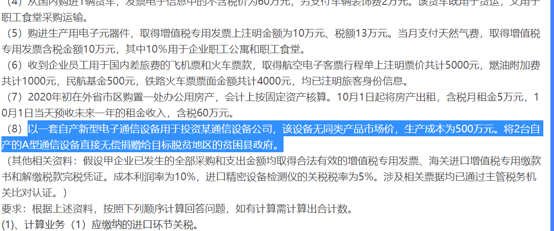(2)将2台自产的A型通信设备直接无偿捐赠给目标脱贫地区的贫困县政府。 直接捐给目标脱贫地区, 免增值税的销项,没有销项则不能抵扣进项,为什么不能作进项税转出