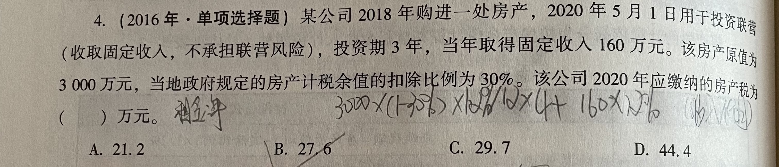 这道题我算的是3000×(1-30%)×1.2%/12×4+160×12%/12×8=21.2,答案是B 27. 6,请问哪个算法对