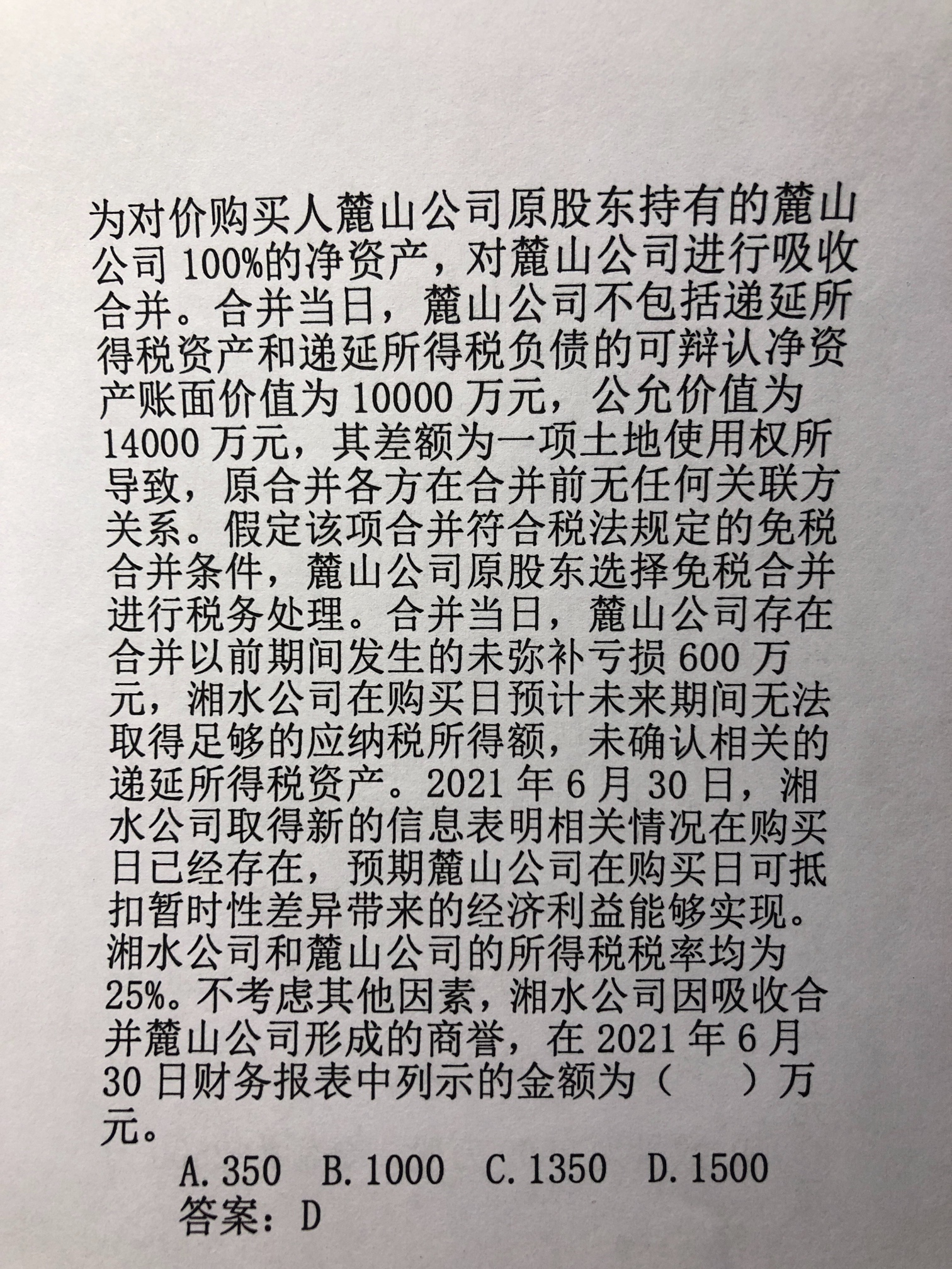 【因为免税合并,商誉的计税基础为0,直接扣减资产的公允价值】