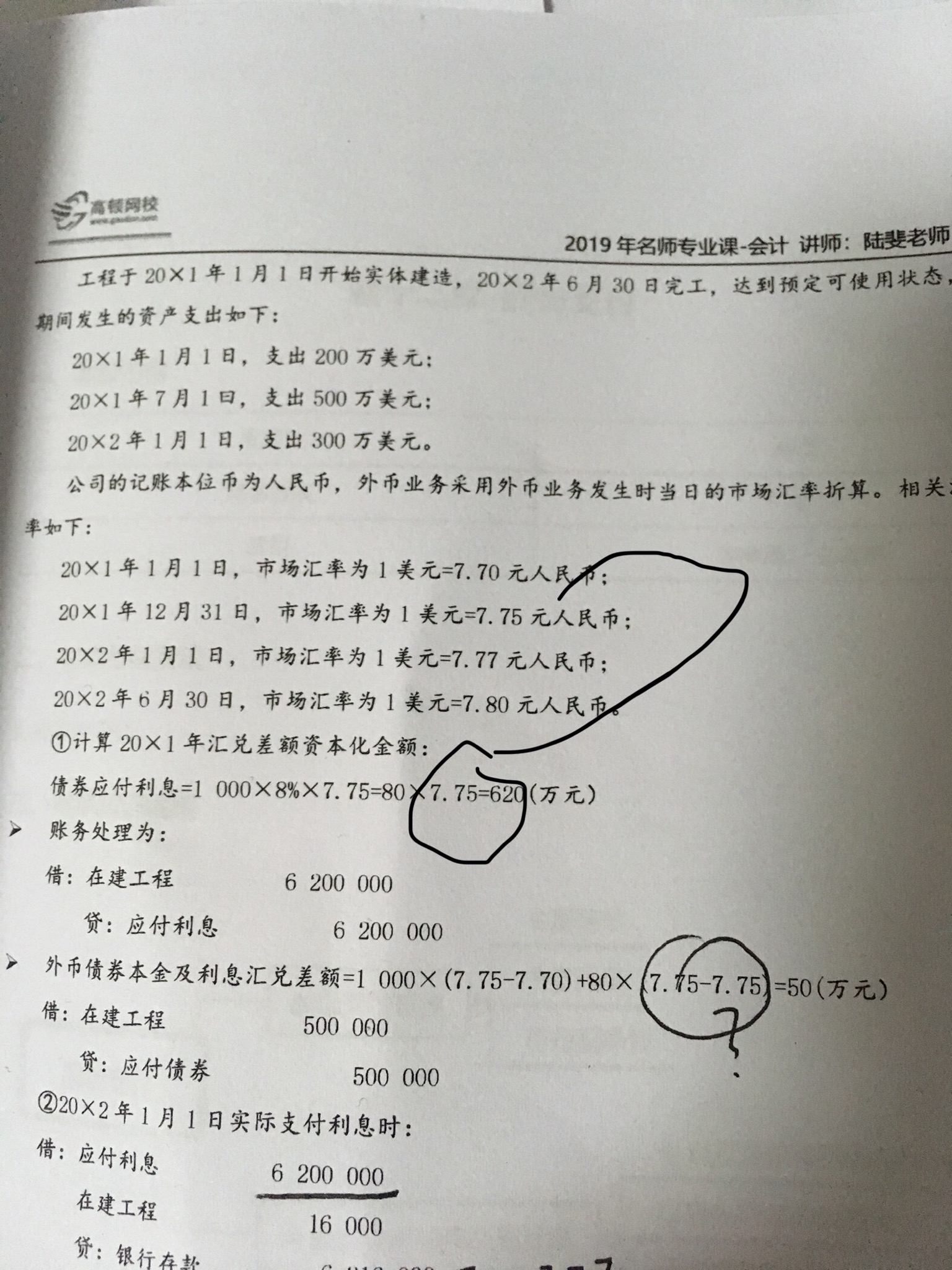12.31账务处理时用7.75,到了1.1支付时,发生了汇率波动,实际支付用的汇率是7.77,因此会有差额=80*7.77-80*7.75=1.6万元,借记在建工程。