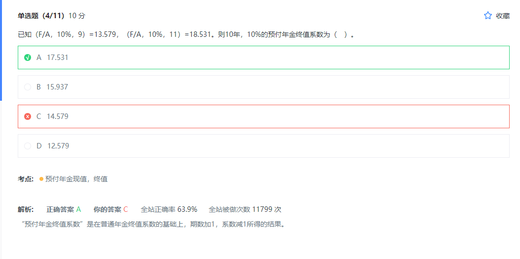 这个题求的是预付年金终值系数哦,你选的C选项是预付年金现值系数的答案,注意审题哈