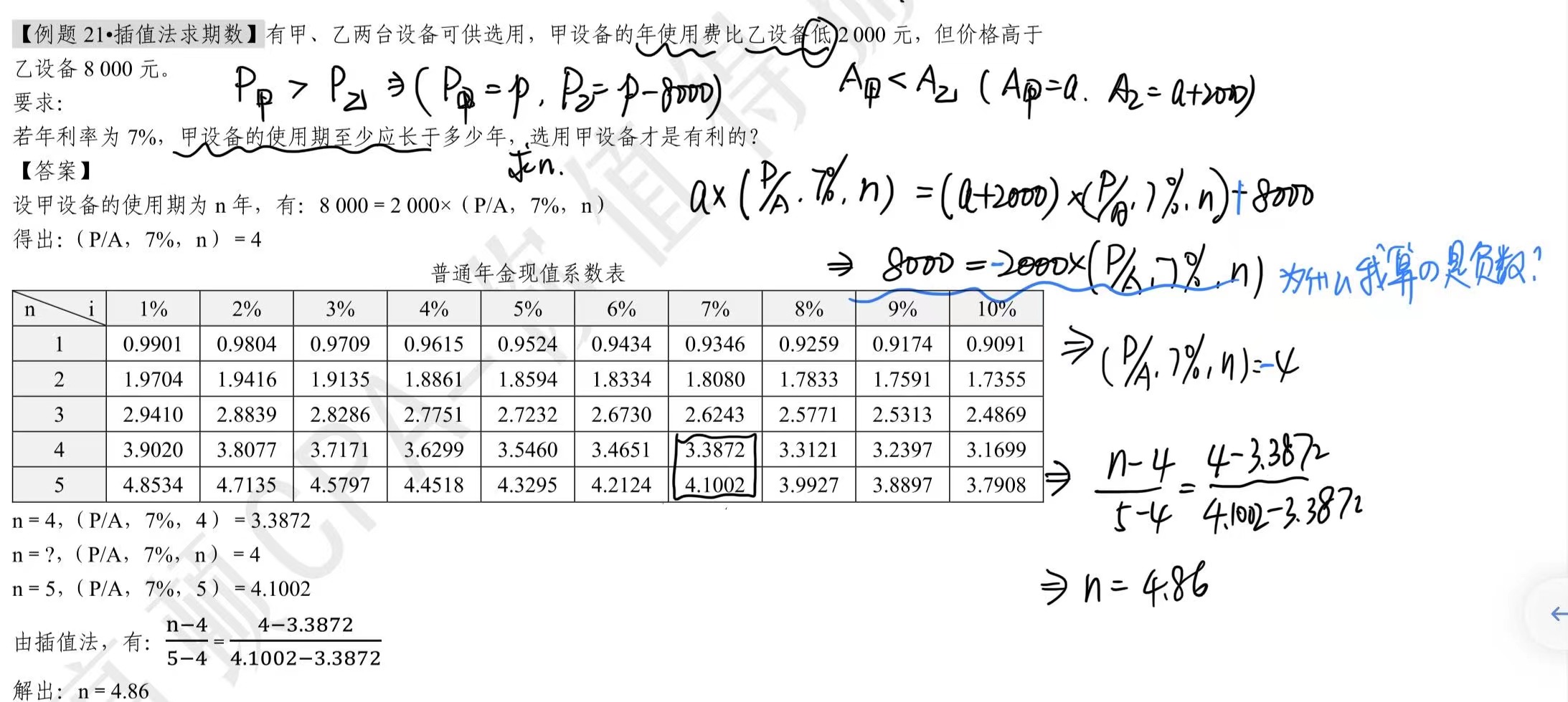 使用乙设备,会在未来n年每年流出2000元,所以使用乙设备,现值=-2000*(P/A,7%,n),