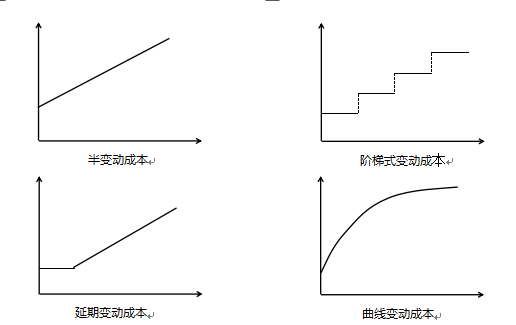 半变动成本是不是不管有没有量都有一个固定成本,量越多成本越大,而延期成本意思是量不超过某个范围成本是固定的,当超过某个值则随着量成正比增长