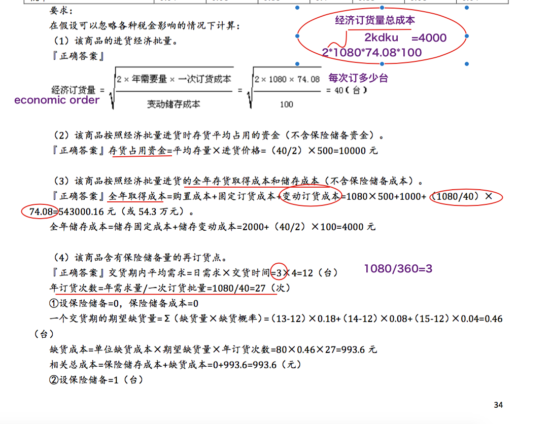 (2)存货总成本=取得成本+储存成本+缺货成本 =[购置成本+订货成本(变动+固定)]+储存成本(变动+固定)+缺货,这个公式也没有问题,如果有保险储备,要考虑使缺货成本和保险储备之和最小的成本。