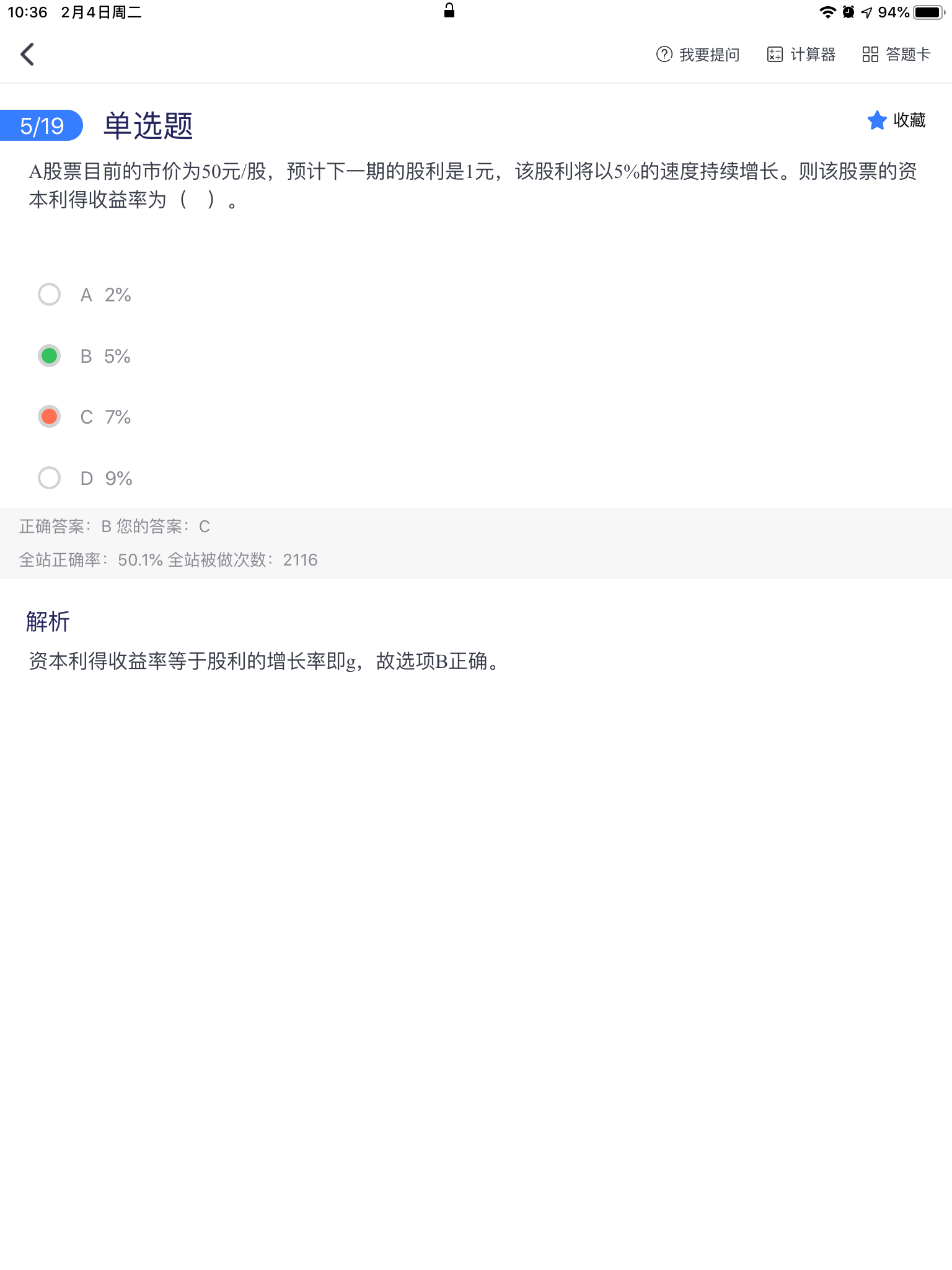 而资本利得收益率=股价增长率,所以,固定股利增长率中的g,可解释为资本利得收益率。所以B对