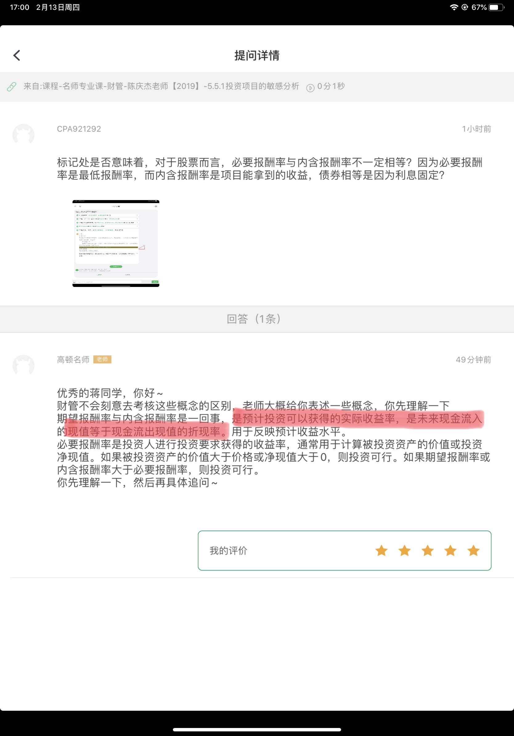 Grace同学,你好,关于为何标记处相等?项目实际收益率为何是流入等于流出的收益率? 我的回答如下