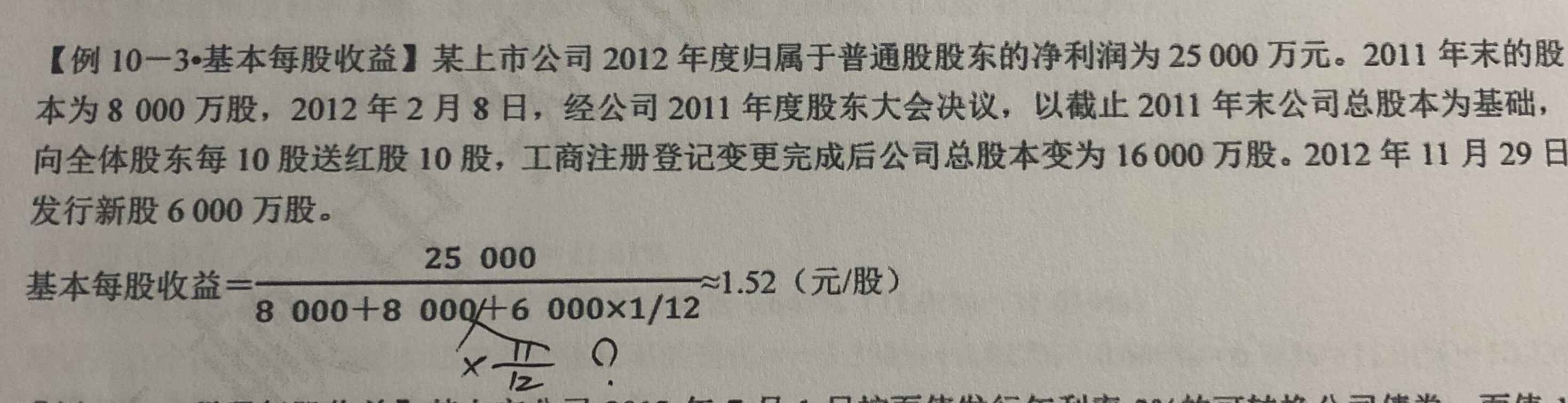 公司2011年度分配10送10导致股数增加8000万股,由于送红股是将公司以前年度得未分配利润转为普通股,转化与否都一直作为资本使用,因此新增的这8000万股不需要按照实际增加的月份加权计算,可以直接计入分母!