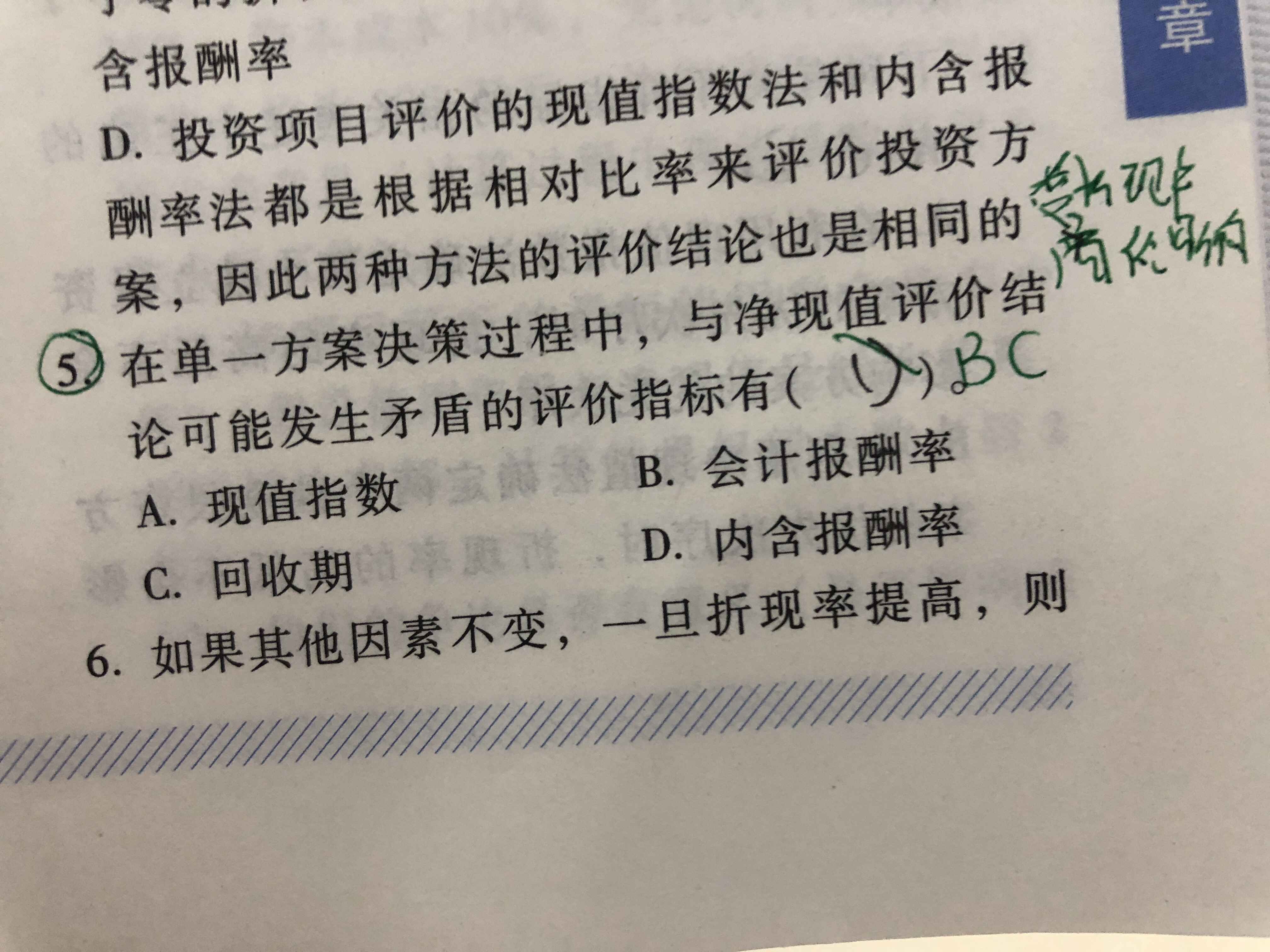 题目给了前提条件:单一方案决策。也就是对同一个项目来说,当净现值>0时,现值指数肯定也大于1,内含报酬率肯定也大于必要报酬率,所以这3种方法对同一个项目来说,决策一致~而回收期法、会计报酬率法可能产生相反的结论~