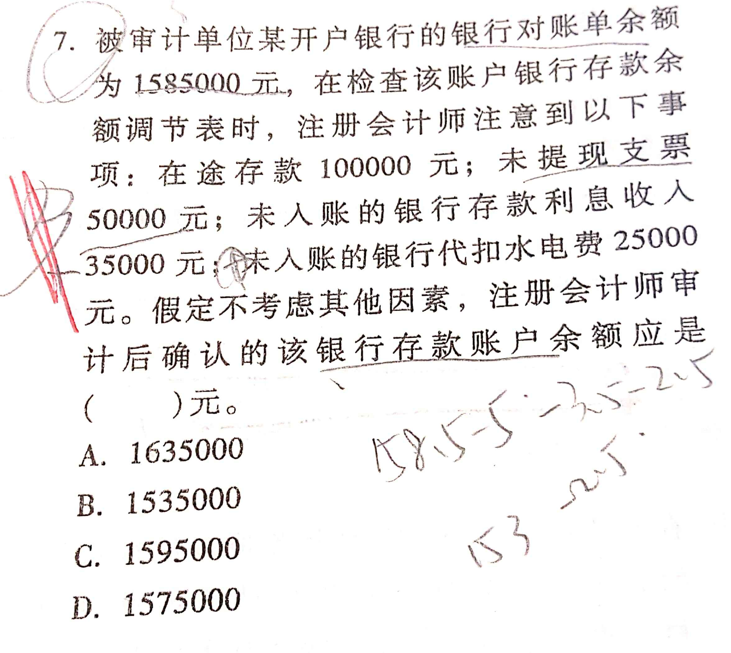 这题选项为A不理解。其中在途存款10万,未提现支票5万,这句话不理解,这个是银行已经记了,企业未记录的吗?后面的3.5万和2.5万是银行入账但企业未入账的意思吗