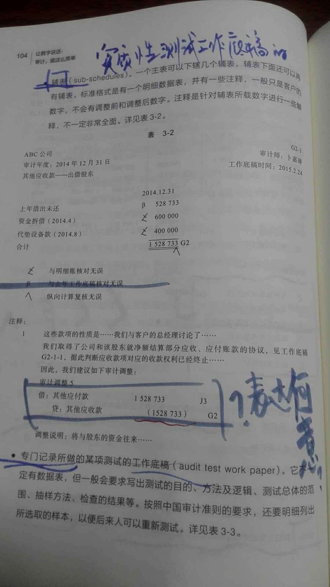 Wendy同学,你好,关于上图是《让数字说话》审计入门书,该书104页讲实质性测试工作底稿的辅表,其中审计调整的会计分录 借: 我的回答如下