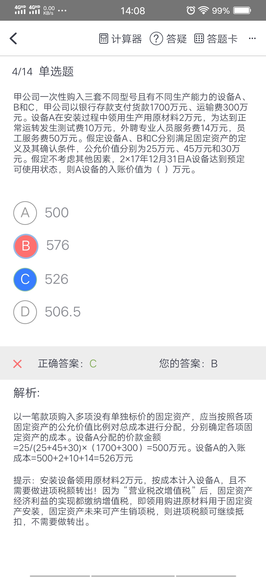 佳敏同学,你好,关于这里员工服务费50万元的金额,为什么不计入A设备的成本呢? 我的回答如下
