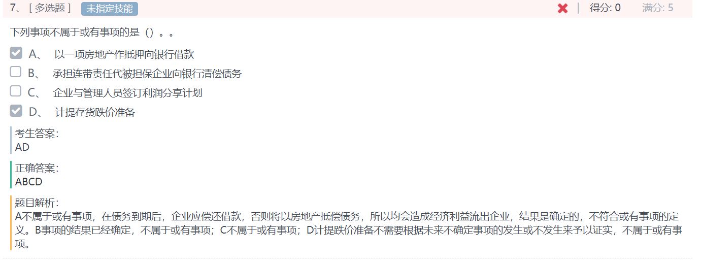 B 只有被担保人还不了钱,担保人才需要承担责任,所以是“由某些未来事件的发生或不发生才能决定的不确定事项。”