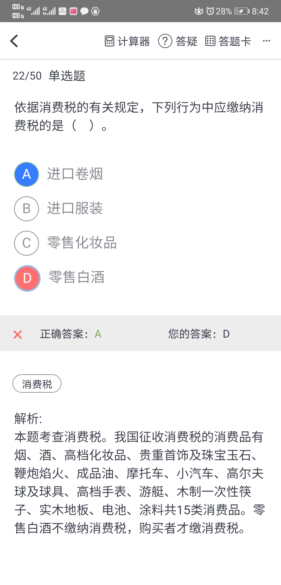 进口卷烟包含在这一大类里,没有单独提出说明的,都征收消费税。而零售化妆品没说是高级化妆品所以不选。