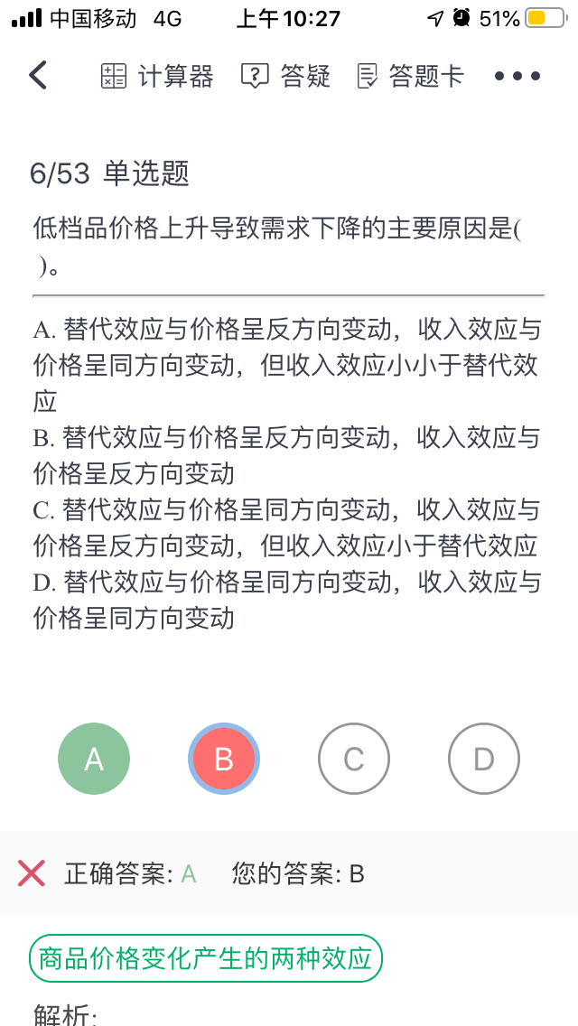 从应试的角度可以记住替代效应永远大于收入效应,那么从替代效应来看,低档品的价格上升,你就会寻找替代品,因此对这个低档品的需求量减少,因此替代效应与价格是反向变动。从收入效应来看,低档品的价格上升,你的工资没变,所以你手里的货币购买力就会下降,因此在你比较穷的时候就只能继续买低档品,因此收入效应与价格是同时增加或减少,属于同向变动。