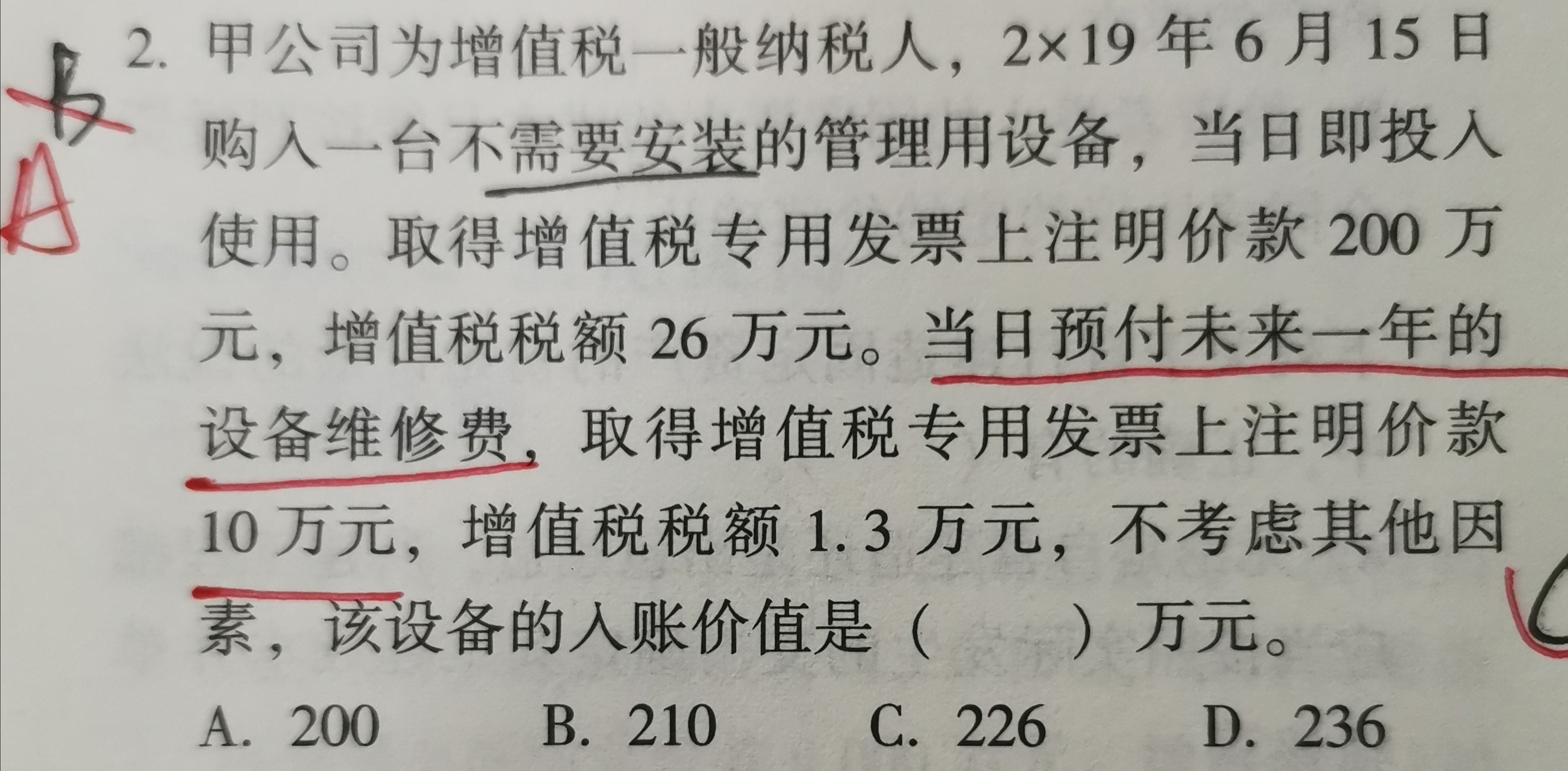 在本题中,设备维修费只是预付费用,在购买时没有实际发生维修情况,不属于达到预定可使用状态之前发生的成本,所以计算入账价值时不需要考虑这个费用。