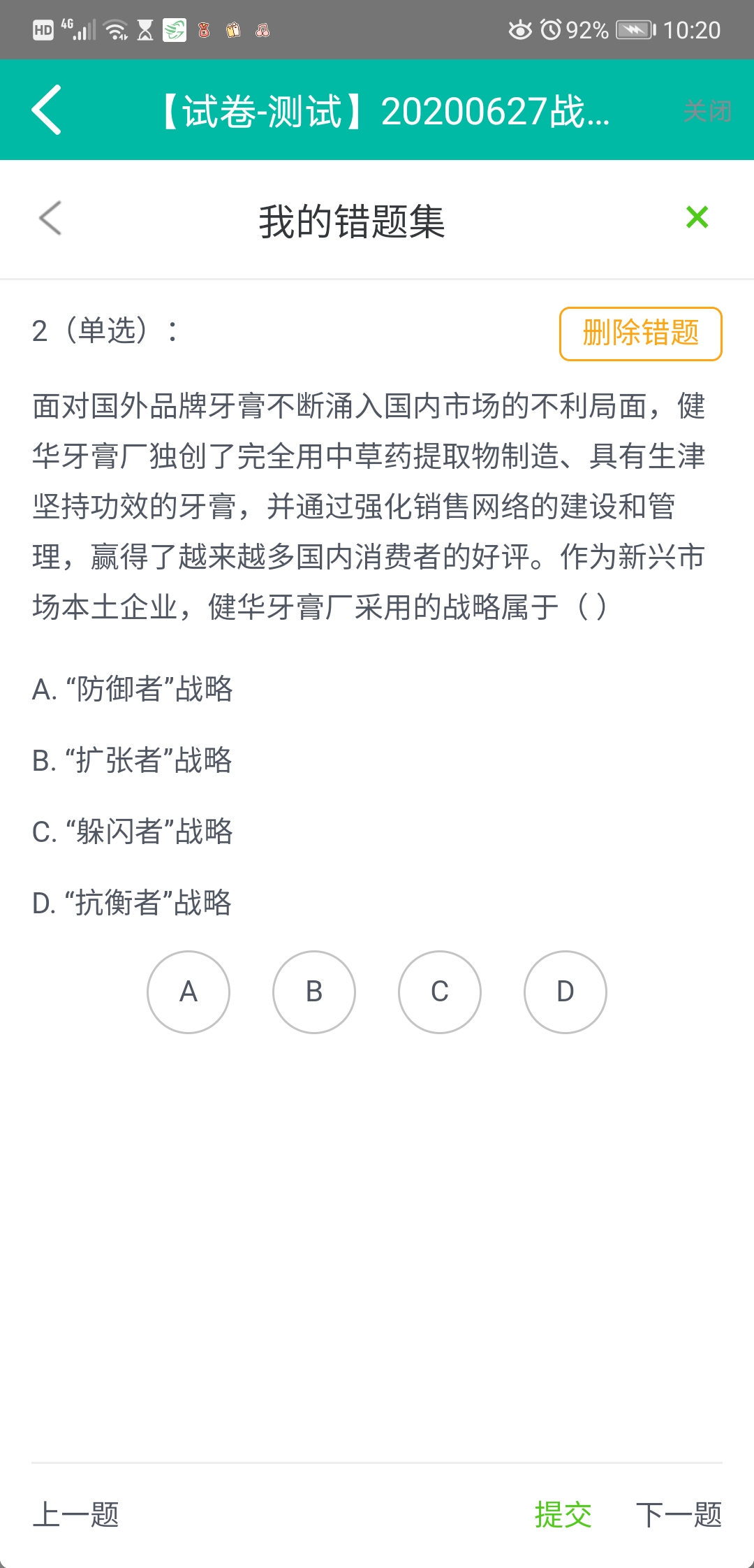 这道题并没有说全球化程度高低,而且防御者的战略里面明确说加强分销网络对的建设和管理,但是答案为什么是躲闪者?