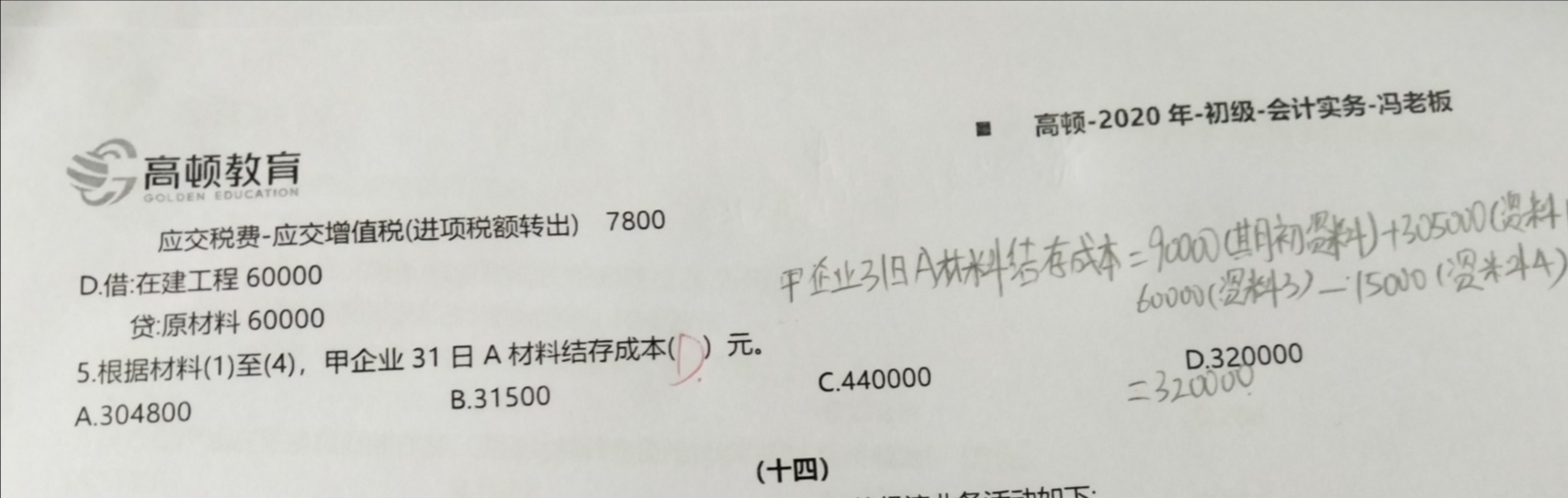 小野果儿同学,你好,关于你好,请问第十三题的第五小问A材料结存成本是什么意思? 我的回答如下