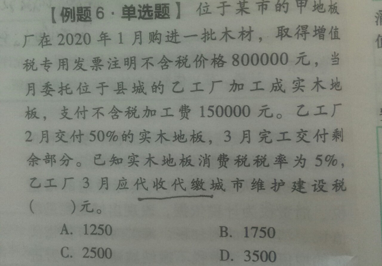 应代收代缴城建税=(150000+800000)×50%/(1-5%)×5%(消费税税率)×5%(城建税税率)=1250(元)
