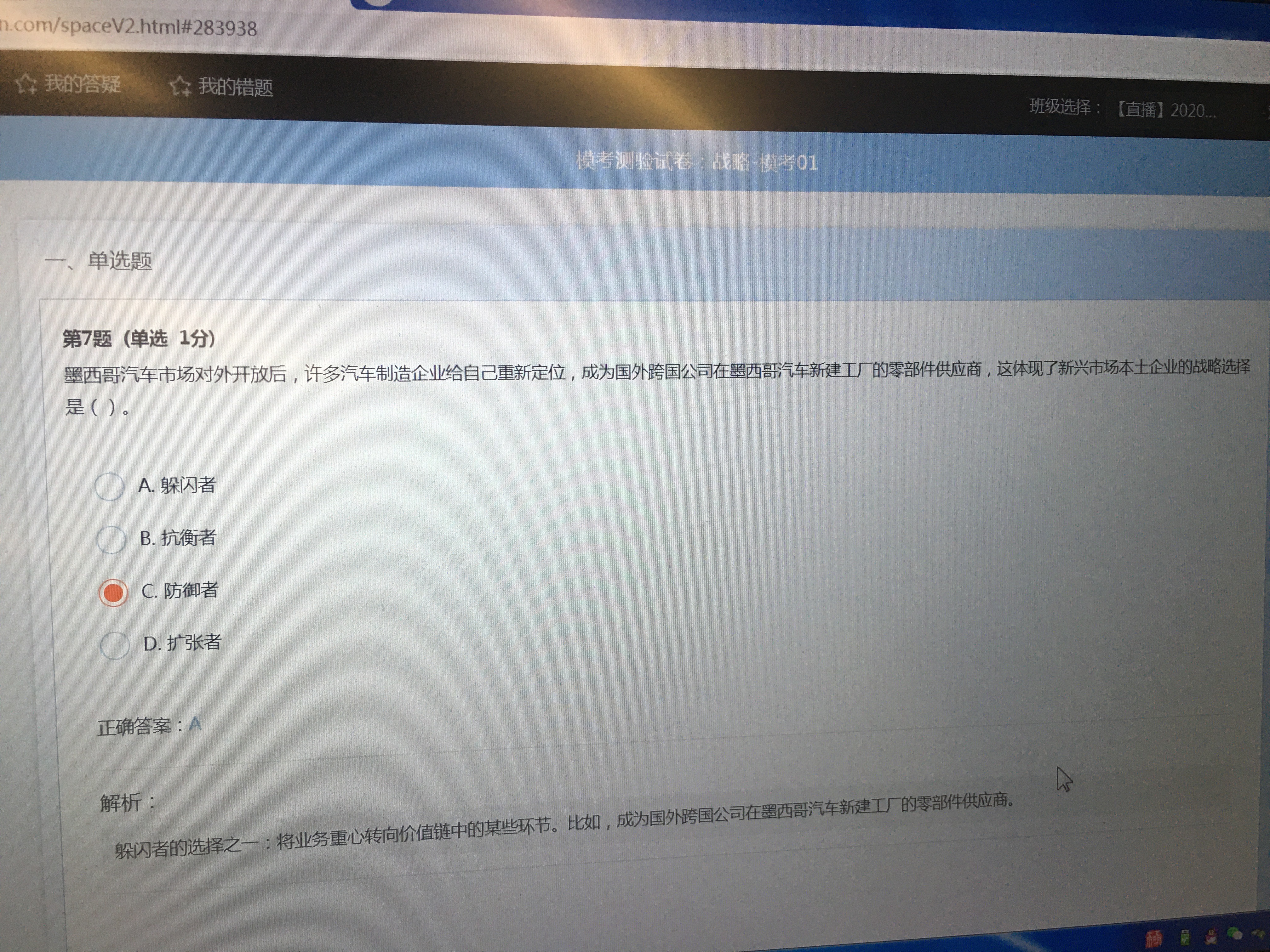 本题强调的是将业务重心转移为价值链的一环,体现的就是躲闪者的特点哈。防御者是需要集中力量保护已有的市场份额不被跨国竞争对手侵占,企业只能利用国内市场的优势进行防卫,在题目中没有体现;继续加油