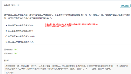 会计第7章练习题,第26题与第1/第13题有疑问 1.为什么后面两个第2道工序不是100%? 2.第26题,为什么不考虑各道工序完工程度的百分比?也就是第13题,第1题里的百分比