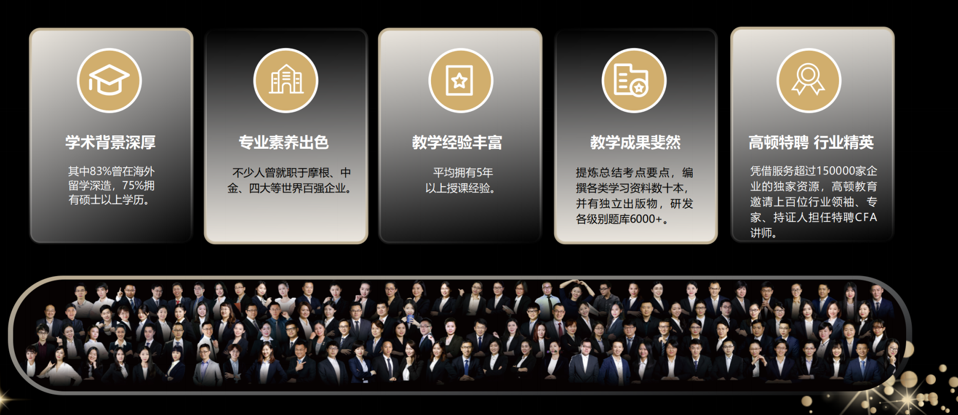 2.教师自身需拥有优秀的教育背景,在高顿的教研队伍中,大多全职老师都毕业于清北复交或国际top著名高校,83%拥有海外学术背景,90%拥有硕士及以上学历,60%为CFA持证人。