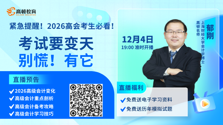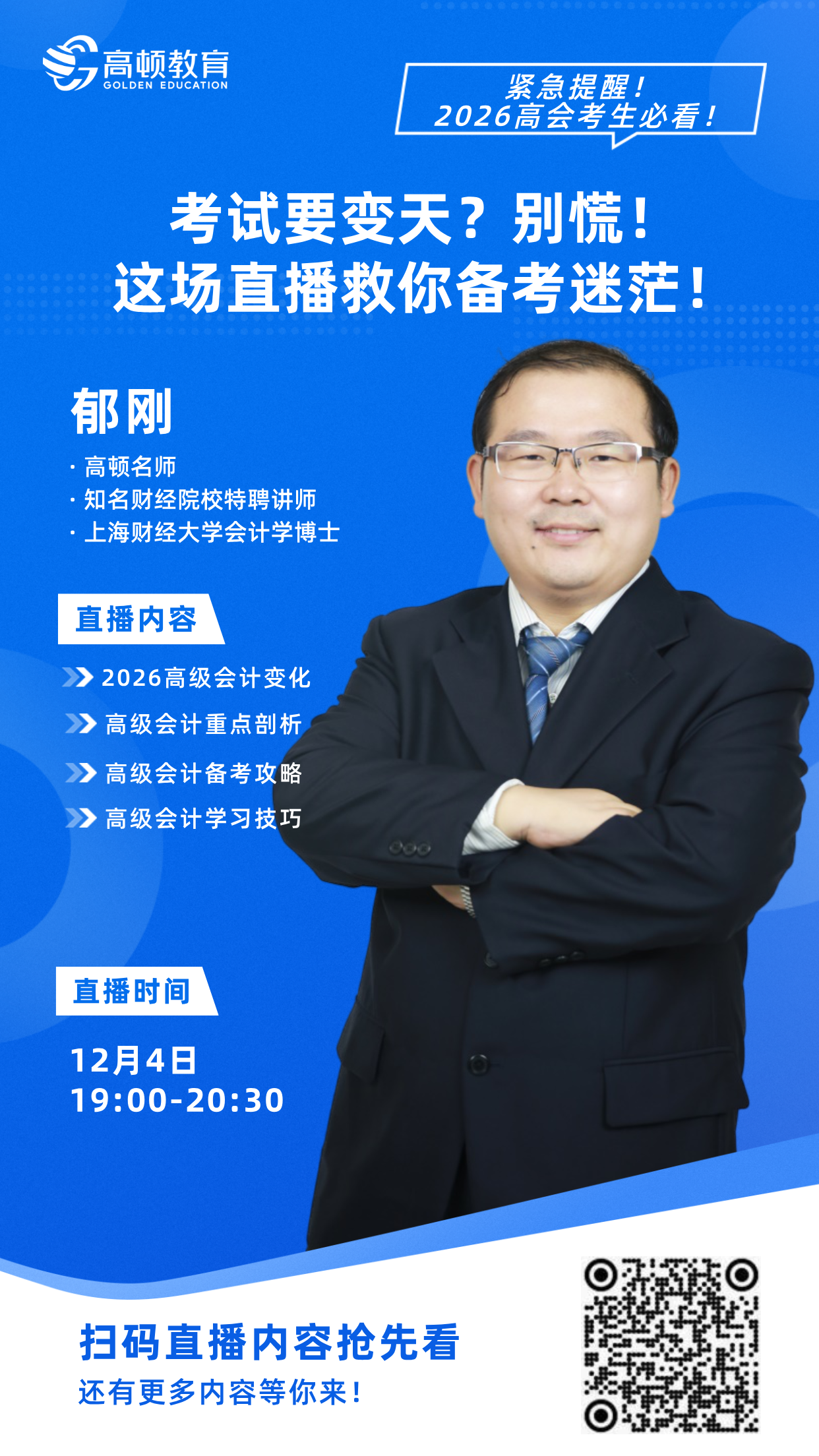 要知道,高会考试向来调整不断。2025年部分地区刚优化社保审核要求,智能财务案例题就已纳入考试范围。面对2026年可能出现的新变动,盲目备考、摸不清方向,只会让努力付诸东流。别担心!12月4日19:00-20:30,高顿名师郁刚老师将在微信视频号开启专属直播,凭借多年高会教研与评审经验,为你拨开备考迷雾,避开“陷阱”、抓准重点,给你满满的备考“定心丸”。