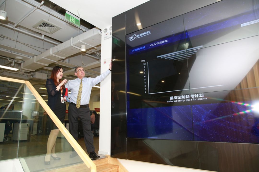 Prof. Alistair Fitt先生一行,在高顿教育留学事业部总经理的陪同下,参观了高顿教育EP智能网课和Glive私播课数字大屏。对于高顿教育将教育科技运用于财经教育服务,Alistair Fitt先生给出了非常高的评价。