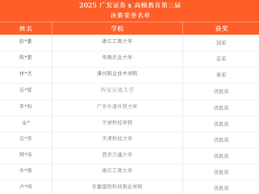 从初赛的千军万马突围,到决赛的巅峰对决,第三届全国大学生模拟投资大赛不仅为全国大学生搭建了一个以赛促学、以赛交流的专业平台,更依托广发证券的行业资源与高顿教育的教研优势,让同学们在模拟实践中深化了对金融市场的认知,提升了投资分析与风险管控能力。