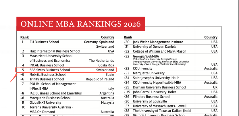 我们非常自豪地宣布,在备受全球瞩目的《CEO Magazine》2026年度全球在线MBA排名(Online MBA Rankings 2026)中,瑞士商学院的在线MBA项目,一举斩获全球第5名的卓越成绩!这一成绩再次巩固了瑞士商学院在全球在线MBA教育领域的领先地位。它意味着,无论您身处何地,都能通过瑞士商学院获得高品质的国际化MBA教育体验。